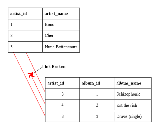 Obrázok z Wikipédie ukazuje, čo by sa stalo, keby databázový systém nevynucoval referenčnú integritu. V zozname albumov by mohol existovať riadok ktorého pole artist_id by ukazovalo na neexistujúci záznam v tabuľke autorov. Dáta by tak boli „rozbité“ a chybné.